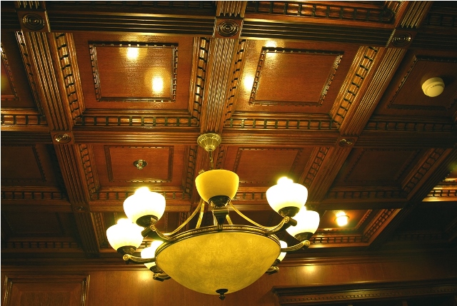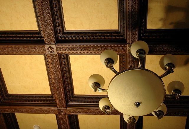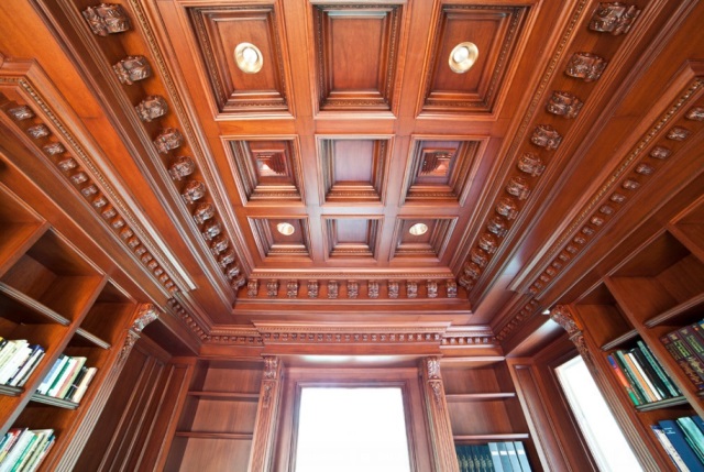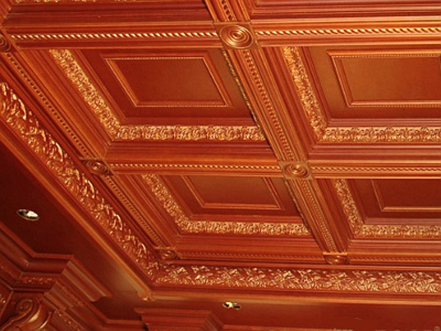 Безусловно, наиболее эффектным из всех станет кессонный потолок. Его можно встретить в самых шикарных офисах и богатых домах. Конструкция очень сложна в изготовлении и монтаже, так что, если у вас нет опыта выполнения таких работ, лучше пригласить опытного мастера или выбрать другой тип украшений. Однако, существует несколько разновидностей украшенных резьбой конструкций, которые можно будет воспроизвести самостоятельно, используя готовые составляющие.