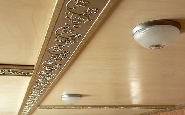 - Украшение перекрытий панелями из тонких листовых материалов наподобие фанеры или МДФ позволит существенно снизить затраты на отделку и при этом, создать оригинальный и очень красивый интерьер.