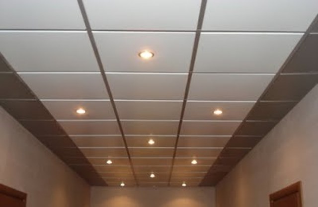 Подобная отделка перекрытий чаще встречается в офисных или коммерческих помещениях, нежели в жилых домах. Тип каркаса здесь отличается от предыдущего варианта и представляет собой перекрещивающиеся металлические профили, на которых фиксируются декоративные металлические панели. Существуют разновидности плит с перфорацией, позволяющие создать проницаемую для воздуха плоскость.
