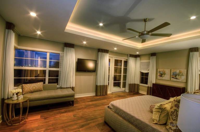 - запотолочная подсветка в центре комнаты, вокруг второго уровня потолка в виде цветка или звезды, и точечные светильники по периметру;