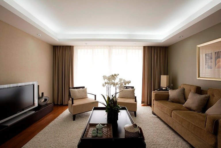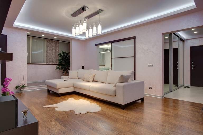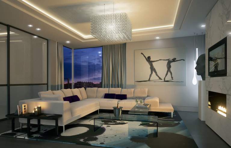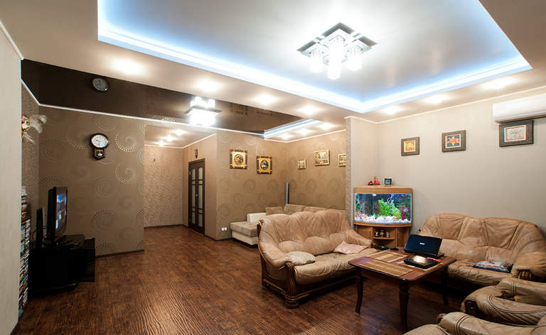 Первый тип представлен большим осветительным прибором (люстрой, «потолочной таблеткой» или большой панелью), расположенным в центре помещения или зоны, выделенной двухуровневым потолком.