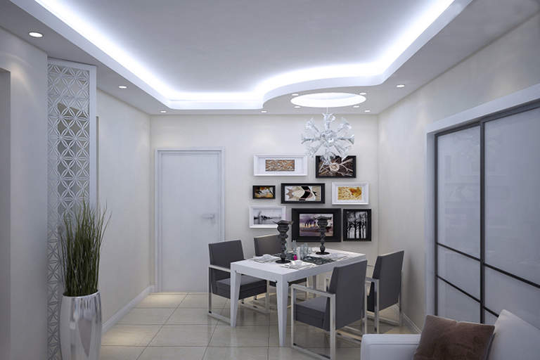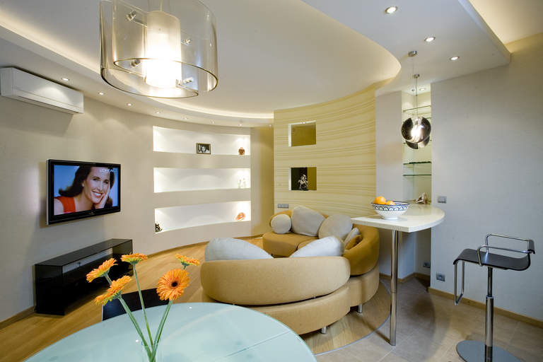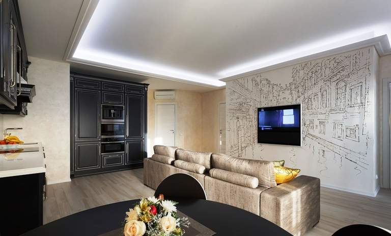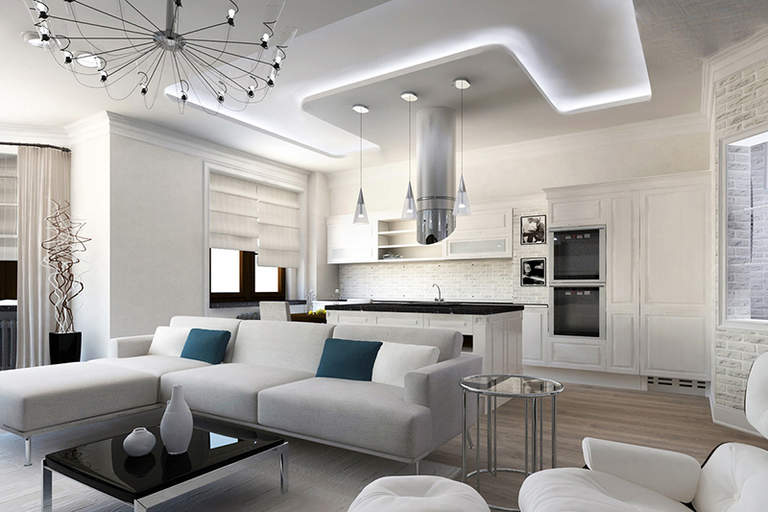 А если у вас квартира-студия или кухня-студия, тогда двухъярусный потолок вам просто необходим, ведь так вы сможете без потери пространства разграничить кухню и комнату или столовую и зону приготовления пищи! Да и для гостиной больших размеров это прекрасная возможность выделить зоны зала, домашнего кинотеатра и столовой.